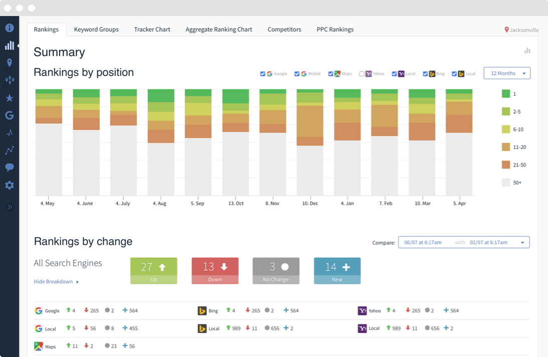- Track rankings across Google, Bing, and Yahoo in a single report